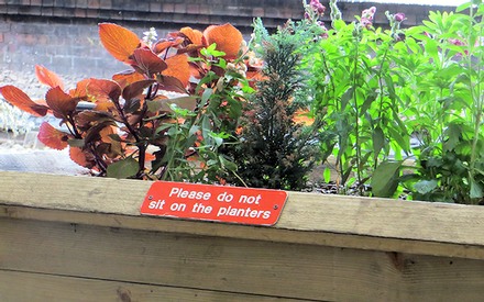 else with it.) "Don't sit on the planters." "Don't sit on the Gap." "This is a customer announcement." Is there any other kind? 'Yes a staff announcement.' OK smarty pants, what about "Take care on the stairs." No, I'm going to behave as though it's flat and trip up over every one.