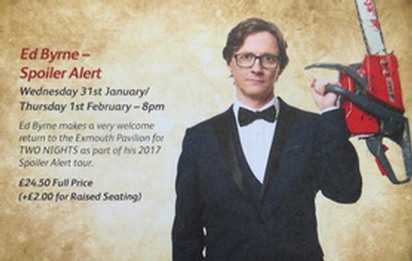 The Pavilion Spring programme dropped through the letterbox. Looks interesting. Turned over two pages and there was Ed Byrne and his 'Spoiler Alert' Tour. It's only a few days away. I wonder if there are tickets left. There was an isolated one in Row H. That'll do.