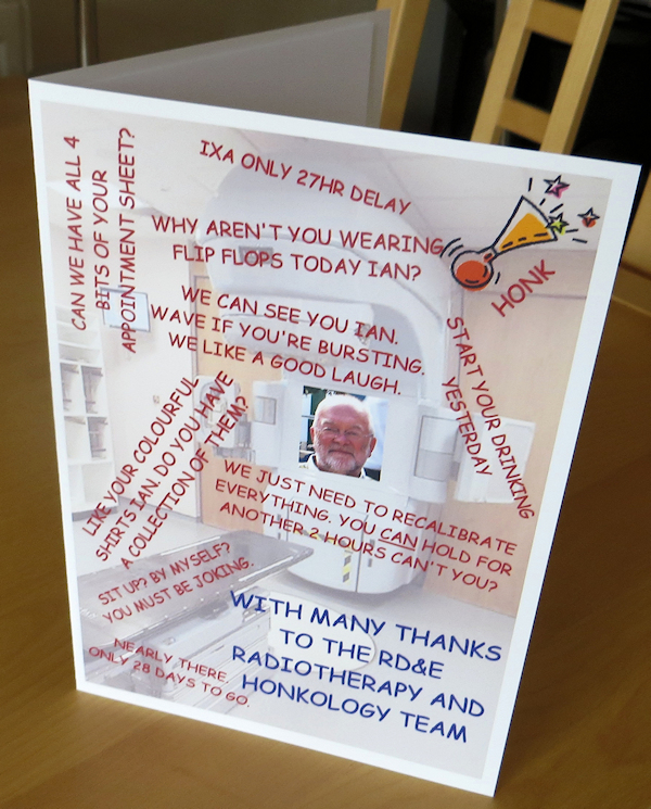 It was a bright dry warm and sunny March day, in my head, as I arrived for my last radiotherapy appointment. Thirty six daily sessions down, just one to go. And that was only the microenemas.