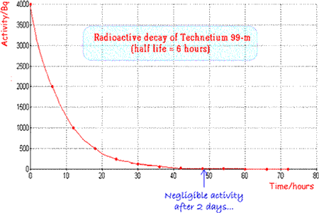 Then a syringe which I ascertained was full of saline solution for those who take salt with their technetium 99 (half life 6 hours, produced by cyclotron bombardment of molybdenum, which produces molybdenum 99, which decays to technetium 99, say 99). For those who prefer it with a dash of something else, ask for technetium 99 with methylene diphosphonate. This adsorbs onto the crystalline hydroxyapatite mineral of the bone and is better than a brandy chaser.