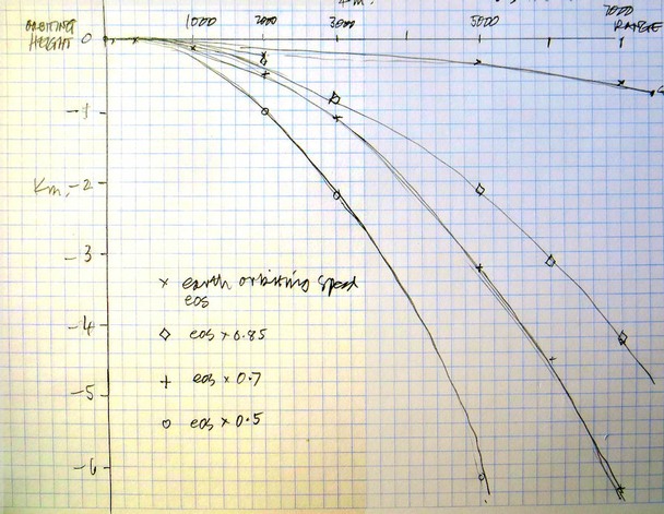 Axes are in km. If he's travelling at earth orbiting speed, the jettisoned package loses height hardly at all after travelling 7000km down range. Superman's speed needs to fall to very much less than orbiting speed for a significant loss of orbiting height. He himself will lose height then of course. The lower the orbiting height, the greater the frictional drag. He'd then need to straighten his leg to reduce the chance of it and adjacent parts burning up.